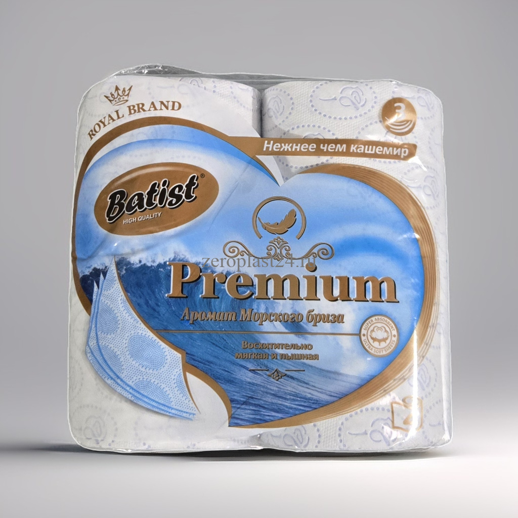 Туалетная бумага Batist Premium 3 слоя 4 рулона 20м Морской бриз – мягкая и пышная туалетная бумага, обладающая приятным ароматом апельсинового дерева. Производится из 100% первичной целлюлозы и не содержит вредных компонентов. Отличается прочностью, не рвется и не расслаивается, экономично расходуется. Благодаря трехслойной структуре прекрасно впитывает влагу, а особое тиснение и перфорация обеспечивают дополнительный комфорт и удобство в использовании. Бумажная продукция ТМ Batist отличается гигиеничностью и высоким качеством, поэтому отлично подходит для всей семьи