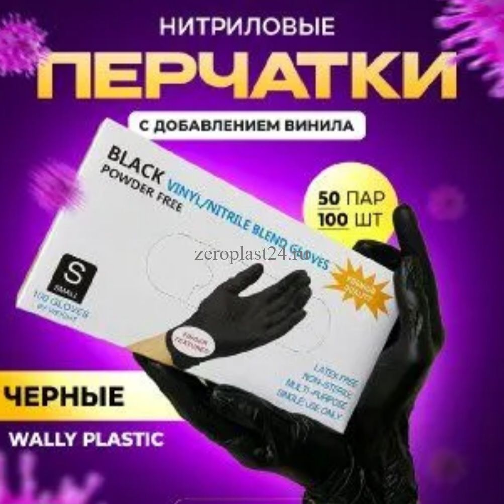 Перчатки Wally Plastic винил/нитрил, неопудренные, черные, S, 6-7, 100шт