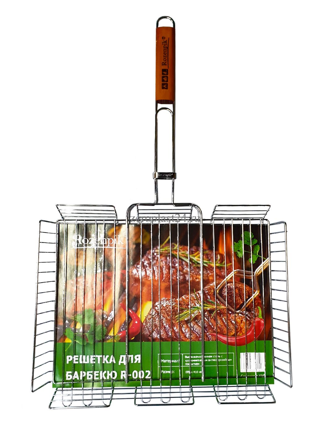Предлагаем вам приобрести универсальные решетки для гриля и барбекю RozeNpik R-002. В ассортименте представлено изделие, созданное из экологически чистых материалов, имеющее размеры 71,5 на 43 на 42,5 сантиметра. Основа решетки для мангала и барбекю сделана из нержавейки с пищевым хромированным покрытием. Длинная ручка дополнена деревянными вставками. Ее удобно удерживать и одной, и двумя руками. Переворачивая изделие, вы не обожжетесь, ведь дерево не нагревается и его удобно держать. Фиксирующее кольцо широкое, которое обеспечивает надежное закрепление верхней створки.